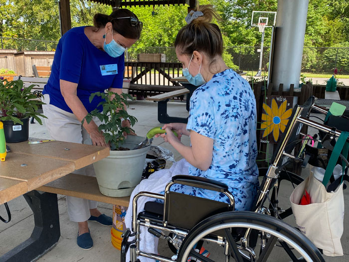 INOVA Mt. Vernon Hospital is a 67-bed, in-patient acute rehab hospital serving patients with cerebrovascular accidents and strokes, brain and spinal cord injuries and/or amputees. Over the years, the Therapeutic Recreation (TR) team has incorporated gardening into their services and the garden has evolved from a 10’ x12’ raised garden to a Therapeutic Pavilion, where teams of trained therapists use gardening tasks to work on individual patient goals. The TR team collaborated with a Horticulture Therapist to create a year-round, interdisciplinary program. Weekly group sessions engage patients in a variety of activities, including: seed starting, propagation, floral arrangement, accessible garden techniques and mindfulness activities. All sessions are centered around a plant metaphor that relates to a patient’s experience in rehabilitation and healing to the plant life cycle/nature.