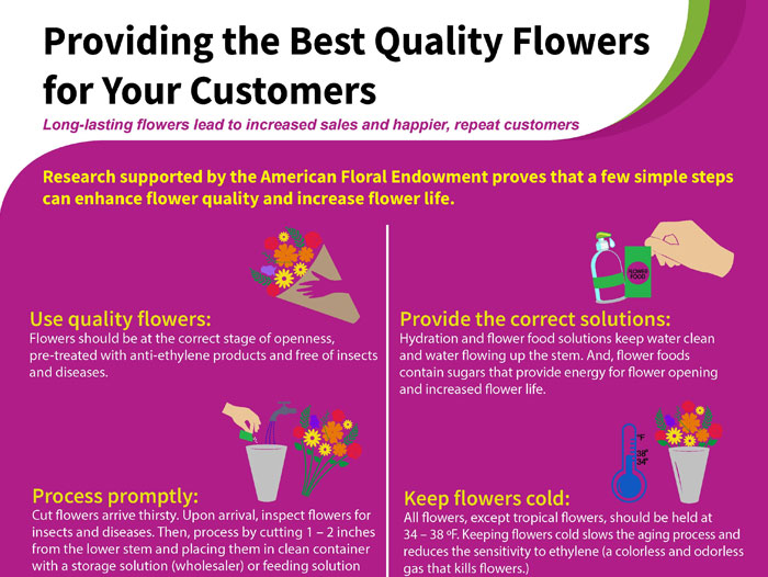 “Having a bright, colorful poster on the wall in the shop is a great resource when onboarding new and seasonal employees,” says David Boulton of Flowers by George Inc. in Arlington, Washington. “It’s also a great reminder for our longtime employees to keep coolers cleaned and check the temperature regularly.”