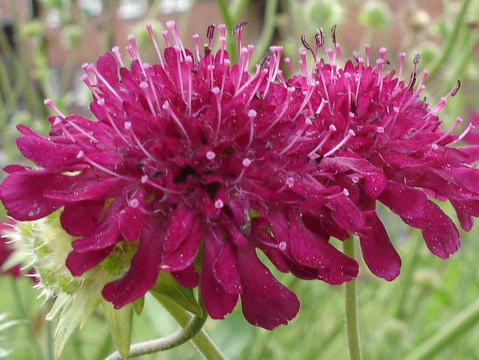 - Macedonian scabious (Knautia macedonica) – Dark pink to burgundy flower heads on tall stems. Flowering period: July-September. Height: 3 ft.