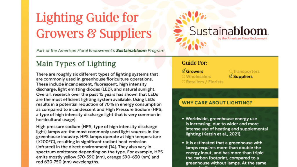 The new Lighting and Water Conservation guides join an extensive collection of SustainaGuides available through the Sustainabloom website, developed by the American Floral Endowment (AFE). These new additions continue Sustainabloom’s mission to make sustainability approachable for all segments of the floral industry through clear, data-driven insights and actionable strategies.