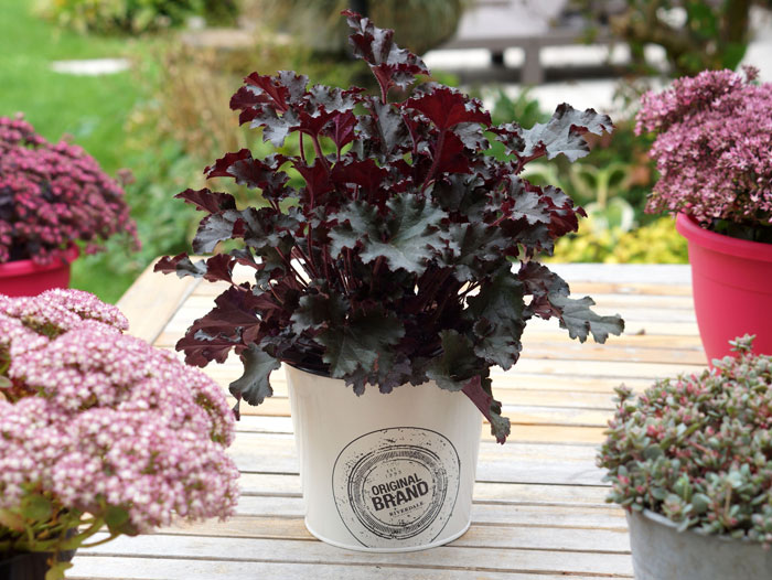 Heuchera ‘Dark Secret’ becomes about 25 cm tall and 30-40 cm wide and fits nicely into perennial borders or mixed containers. ‘Dark Secret’ flowers richly in the summer and is very hardy to -30 °C. It can be planted in full sun, partial shade and shade. ‘Dark Secret’ likes any type of soil and is maintenance-friendly. This makes it an ideal plant for the contemporary garden. This cultivar is protected by Plant Breeders’ Rights and is represented by Plantipp in Europe and by Concept Plants in the US.