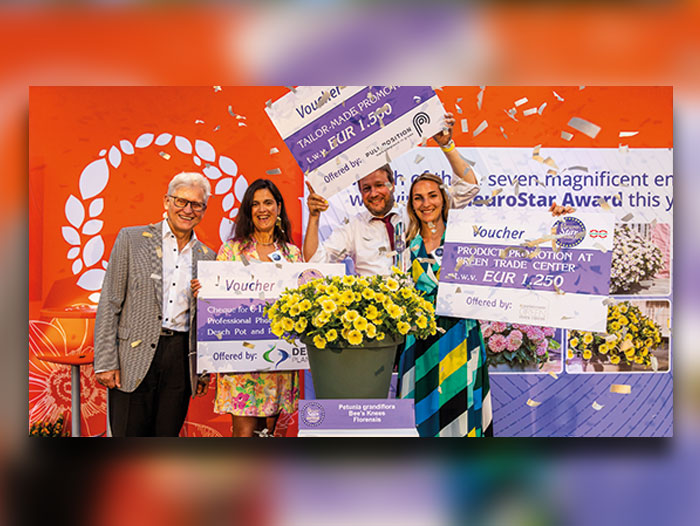 Fleuroselect, the international organisation for the ornamental plants industry, is proud to announce that the FleuroStar Award 2022-23 has been awarded to Petunia grandiflora Bee’s Knees from Florensis. Hagen Kalläne, Retail and Marketing Manager and Marjolein Kuyucu-Lodder, International Product Marketeer, accepted the prize from Fleuroselect President Karol Pawlak and Secretary General Ann Jennen.