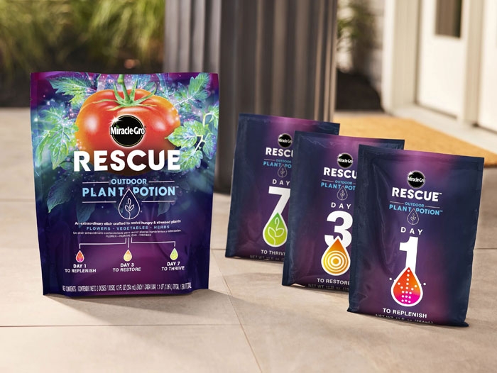 Scotts Miracle-Gro® Rescue Outdoor Plant Potion – single-sachet portioned liquid plant food with a stand-up outer pouch designed to withstand the rigors of eCommerce.