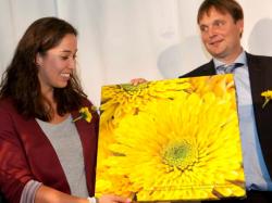 During an interview with Ranomi Kromowidjojo and Laurens van der Lans, presenter Rob Veenman provided some interesting similarities between the achievements of this Olympian gold medal swimmer and the managing of a prominent company specialising in chrysanthemums. The conclusion was that growing chrysanthemums is also a top sport. As an enduring memento of the chrysanthemum named for her, Ranomi Kromowidjojo was presented with a necklace made especially for her and featuring her flower. She was honoured to receive this piece of jewellery.