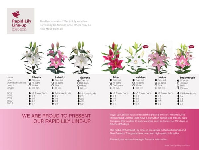 These days the lily market faces major challanges and we would like to respond to these challanges with our rapid lily line-up. Especially for you, as breeder, Royal Van Zanten has shortened the growing time of some Oriental lilies. These rapid lilies have a cultivation period less than 80 days*. Compare this to other Oriental varieties such as Sorbonne (110 days) or Siberia (135 days).