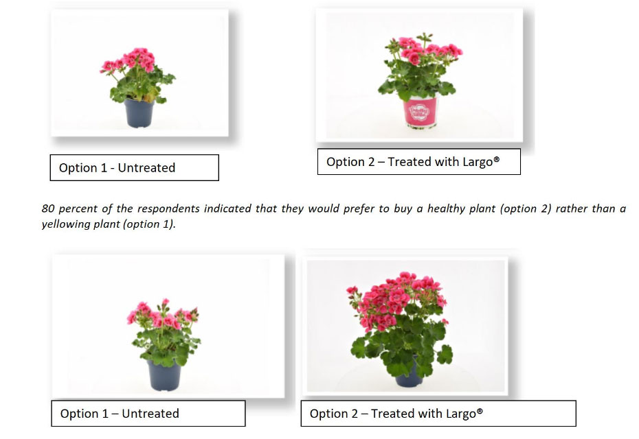 Research conducted by the research agency “Into the minds” shows that no less than 80 percent of respondents prefer plants with many  flower buds and are also willing to pay more for it. In addition, the research showed that consumers prefer the plants treated with Largo and find it important that the plant looks healthy when purchased. This meant having sufficient buds, green leaves and fresh colours. Consumers consider the pot size and the length of the stems to be less important when purchasing.