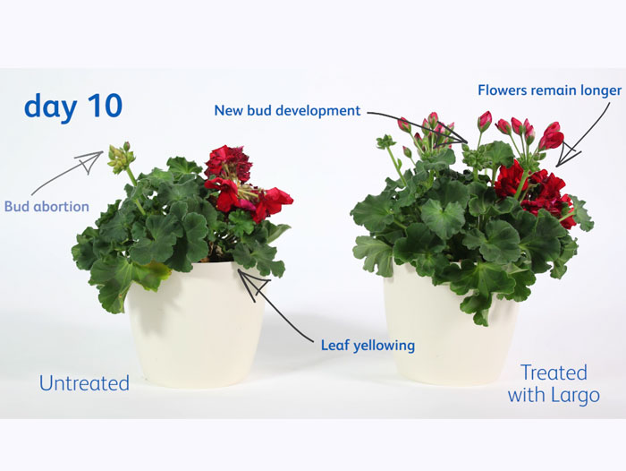 Largo® is a unique and effective product from Chrysal and Syngenta Flowers. It prevents leaf yellowing and petal drop in Pelargonium, both the most common factors of waste. Keeping the flowers beautiful longer, enabling growth of the flower buds, and ultimately lead to more satisfied consumers.
