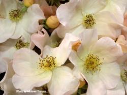 Sally Holmes produces abundant attractive apricot pointed buds and beautiful, almost single, (4 – 8 petals) creamy white blooms with a coronet of bright yellow stamens and mild fragrance, borne in large clusters of 10 to 25 per stem. It repeat flowers in flushes throughout the entire growing season after dead-heading.