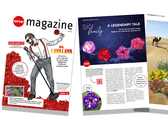 What is it about the new concept of Verbena Mr. LavaLava submitted for the FleuroStar Award? What exciting new varieties are there in the SKYfamily Petunias? And what concepts and trial results are there with regard to drought-tolerant and insect-friendly varieties? On 28 pages of the new ONE Magazine, these and many other exciting questions and trend topics are answered. The new magazine offers you a mixture of current marketing topics, breeding news and service.