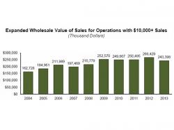 The total 2013 wholesale value of floriculture crops for North Carolina producers with $10,000 or more in sales is estimated at $243.4 million, down 9% from the 2012 total of $266.4 million. North Carolina floriculture sales ranked 5th in the nation, behind California, Florida, Michigan, and Texas. The wholesale value of the selected floriculture crops surveyed with $100,000 or more sales totaled $235.6 million in 2013, down 8% from $255.7 million in 2012.