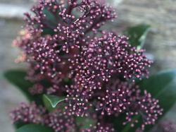 Skimmia belongs to the Rue family (Rutaceae), which the lemon and orange also belong to. That explains the citrus smell which comes out if you squeeze a Skimmia leaf. Skimmia grows in the wild in deciduous forests in Asia. The story goes that Carl Peter Thunberg, a student of Linnaeus, was staying on a Japanese island and needed green feed for his goats. His servants brought him a range of wild plants, one of which they called the Miyama shikimi. Thunberg wrote about this plant and translated it into Skimmia.
