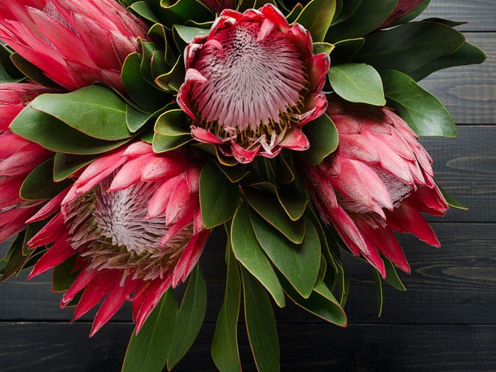 Indigenous to South Africa and Australia, proteas have made their way into many Southern California gardens through the exporting of these exotic plants back in the 1970s. The family of protea is very expansive, with about 14 genera and 1,600 species. These magnificent plants are among florists’ favorites, not only for their beauty, but also for their longevity and usefulness in dried flower arrangements. A typical bouquet may last as long as three to six weeks, or more.