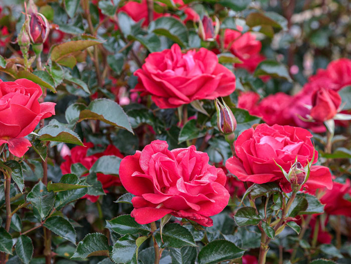 Ruby Red™ is a compact rose that blooms heavily. The flower color is dark red and non-fading against dark green, glossy foliage. It stands out beautifully in the garden and makes an excellent container presentation.