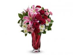She wins. He scores. She'll feel like the belle of the ball when this dramatic bouquet arrives on Valentine's Day. This luxurious mix of luscious red roses and flirty pink lilies is hand-arranged in a swirling, crimson glass vase she'll display proudly every February.