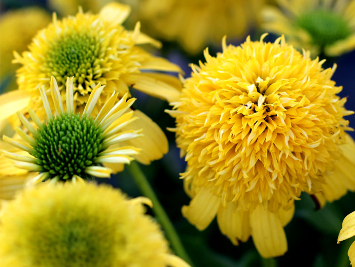 Echinacea SUNNY DAYS Lemon has sunny, double-yellow flowers and emerald green foliage that stands out nicely in a crowed echinacea field. This perennial forms a strong, compact and upright habit, and it offers excellent foliage cover for full containers.