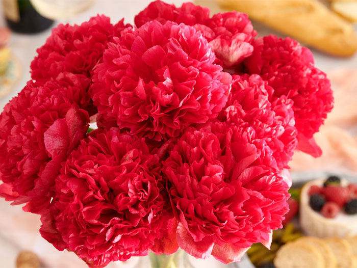 The Command Performance Peonies are grown in France and are carefully selected for their size and color. They are known for their remarkable color-changing abilities after being cut, with blooms starting out red and deep pink, then turning brighter during blooming. After two days, they shift their color to a lighter pink. Eventually they will turn from peach to cream and off white. They have a vase life that can last up to two weeks with proper care.