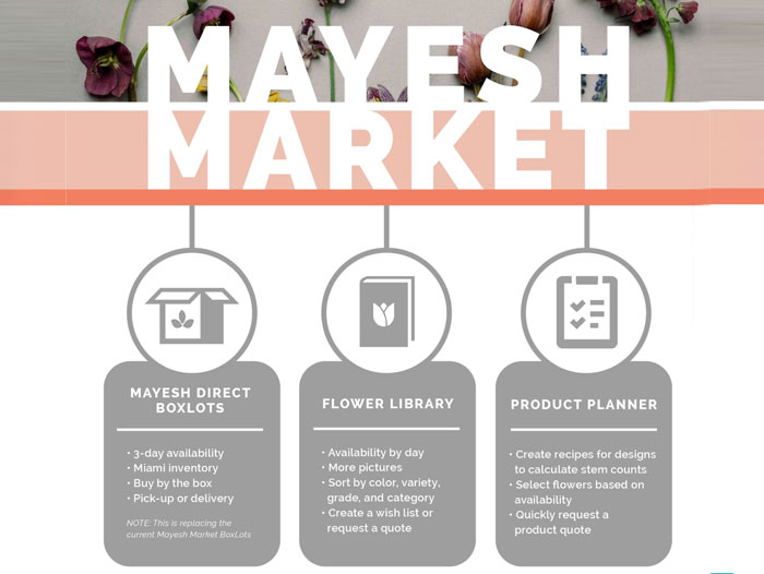 - Mayesh Market is now made up of all of our eCommerce tools: Mayesh Direct BoxLots, the Flower Library, and our brand new Product Planner. Check out an overview here.