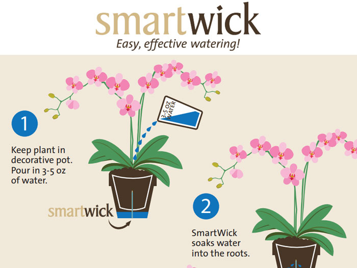 The SmartWick easy watering system is designed to keep each plant perfectly hydrated from farm to store and on to customer homes. After purchase, owners simply fill the water reservoir every week with 3oz. – 5oz. of water, making sure that the SmartWick (but not the plant itself) is partly submerged, then sit back and enjoy fresh blooms. SmartWickdoes all the work to provide easy, effective watering, helping maintain the longevity and optimum health of each beautiful orchid plant.