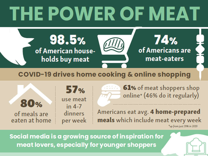 Washington, D.C – The 17th annual Power of Meat report reveals nearly all American households (98.5%) purchase meat, a trend supported by an increase in volume sales (up 3.9% for all meat compared to pre-pandemic levels). This increase is due, in part, to several grocery shopper trends resulting from the COVID-19 pandemic, including increased home cooking, record-high online shopping, and a shift to digital sources for recipe inspiration.
