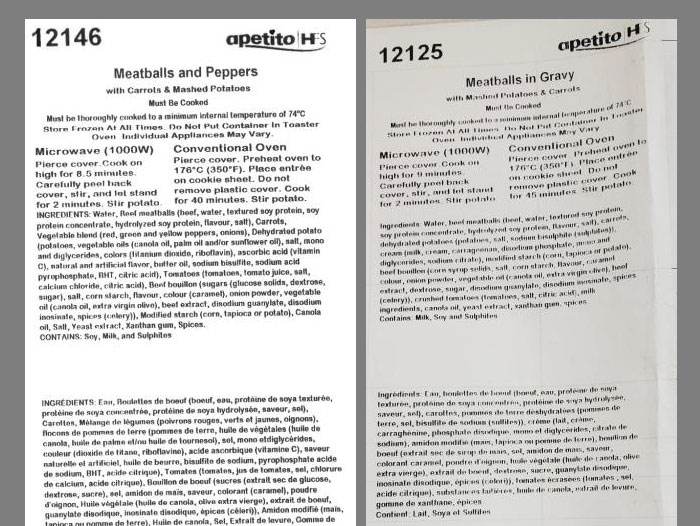 | Apetito HFS | Meatballs and Peppers | 337 g | None | 23 DE 12 23 DE 20 | Egg, Wheat |