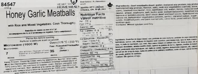 | Heart to Home Meals | Honey Garlic Meatballs | 318 g | None | 23 NO 29 24 JA 09 | Egg, Milk |