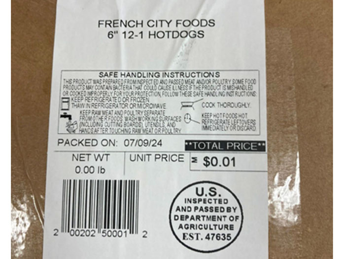 - 10-lb. boxes containing two 5-lb. vacuum-packed packages containing “FRENCH CITY FOODS 6” 12-1 HOTDOGS” and “PACKED ON” with various dates since approximately May 30, 2024, represented on the label.
