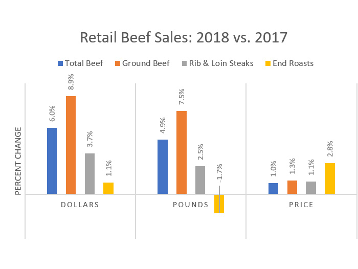 Year-end sales data has arrived and 2018 was an excellent year for beef at retail. Compared to 2017, monthly beef dollar sales were higher throughout the year and total beef sales increased 6.0% nationwide, on sharply higher volumes accompanied by stronger prices (see chart).1As noted previously, these positive factors combined to drive consumer demand for beef higher.2