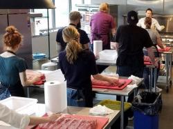 (Photo caption: Attendees gained hands-on experience breaking down the rib subprimal through the guidance of Master Butcher, Kari Underly.)