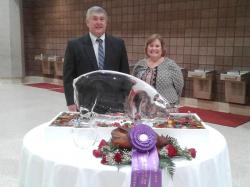It all began last week when the Broadbent entry in the Country Ham competition was named Grand Champion.  “Her smoothness was her crown”, says Dr. Dana Hanson, last week judge of the Country Ham Competition and Meat Scientist from the University Of North Carolina State.  “I called it big boy as we were trying to choose a ham to take to the fair.  It weighed 18.77 pounds and stood out above all the other hams on the table due to its nicely rounded shape,” says Beth Drennan.  Yesterday Dr. Mark and Cindy Lynn and Central Bank ended the charity auction with a partnership each paying the price of $1,400,000. When the auction hit the $200,000 point the auctioneer, Leon Shirk, paused jokingly saying he couldn’t believe he waived his commission on this auction. As the auction continued the price kept climbing until Dr. Lynn offered the partnership and Luther Deaton of Central Bank agreed under the conditions he would walk away with the ham.  Fortunately for Dr. Lynn we had another 1st place ham, so he will still have an award winning ham.”