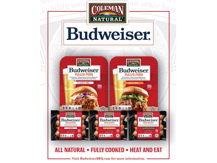 Coleman Natural Foods® is expanding the Budweiser® BBQ collection with the introduction of a Spicy BBQ Pulled Pork and Beer & Cheese Bratwurst flavor this spring. The two new items join the heat & eat roster of fully-cooked pulled pork and bratwurst infused with real Budweiser lager beer taste that was introduced in spring 2019. As with all Coleman Natural products the lineup is sourced from farms that are 100% Crate Free, and never use antibiotics or growth hormones.