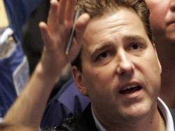Photo Caption: A trader in the hog futures pit of the Chicago Board of Trade signal orders in Chicago, Illinois.