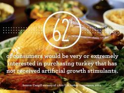 A 2014 survey of turkey consumers revealed that 62 percent of consumers are interested in purchasing turkeys for Thanksgiving raised without artificial growth stimulants and half of consumers are looking for turkeys raised on independent farms.