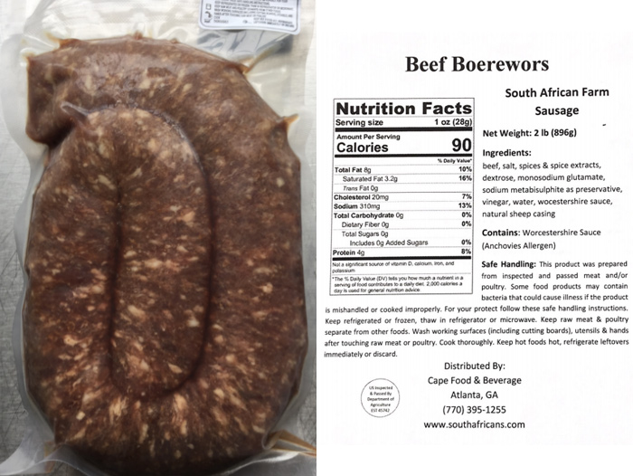 • 1 and 2-lb. vacuum sealed plastic packages of “Beef Boerewors, South African Farm Sausage.”