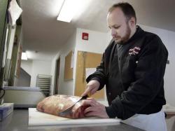 Photo Caption: Erik Piantedosi, owner of Piantedosi Butcher Shop in Plymouth, cuts into a piece of meat.
