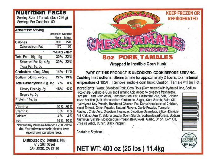 WASHINGTON – Demaiz Inc., doing business as Mex-tamale Foods, a San Jose, California establishment, is recalling approximately 20,759 pounds of pork and beef tamales due to misbranding and undeclared allergen, the U.S. Department of Agriculture’s Food Safety and Inspection Service (FSIS) announced today. The product contains sesame seeds, an allergen, which is not declared on the final product label.