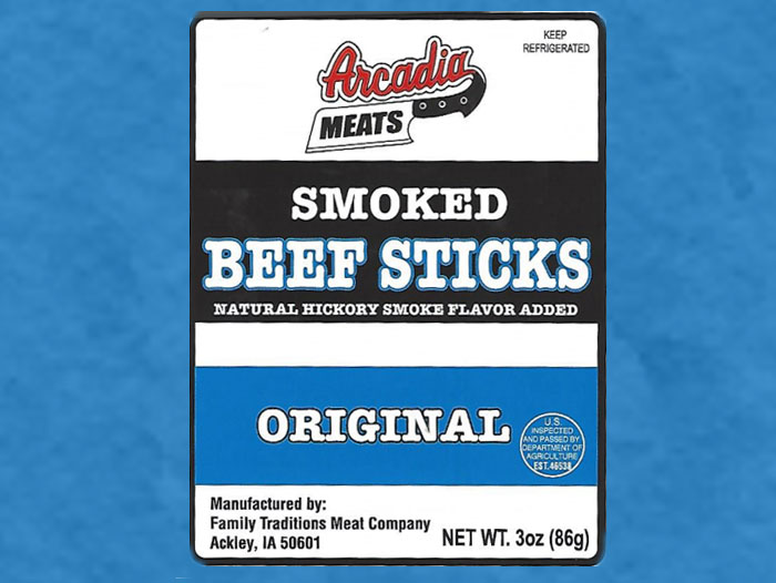 - 3-oz. and 6-oz. vacuum-packed packages containing “Arcadia MEATS SMOKED BEEF STICKS ORIGINAL” with lot numbers 31819, 33719 and 00620.