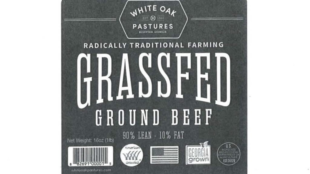- 16oz (1 lb.) PLASTIC, VACUUM-PACKED, packages containing “WHITE OAK PASTURES, RADICALLY TRADITIONAL FARMING, GRASSFED GROUND BEEF”.