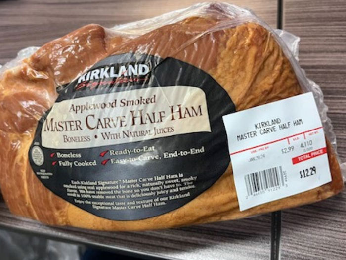 - 4-lb. (average weight) vacuum-packed clear plastic packages containing “Kirkland Signature Applewood Smoked MASTER CARVE HALF HAM Boneless With Natural Juices” with Use / Freeze by date Jan 20 24 and a sticker with lot number 264 – 4.
