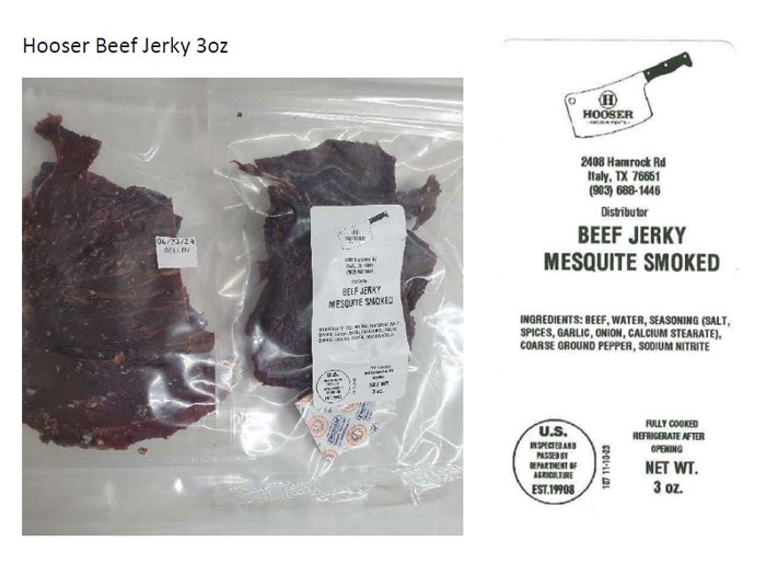 • 3-oz. packages containing “HOOSER CUSTOM MEATS BEEF JERKY MESQUITE SMOKED” and a “SELL BY” of 04/23/24 represented on the back of the packages.
