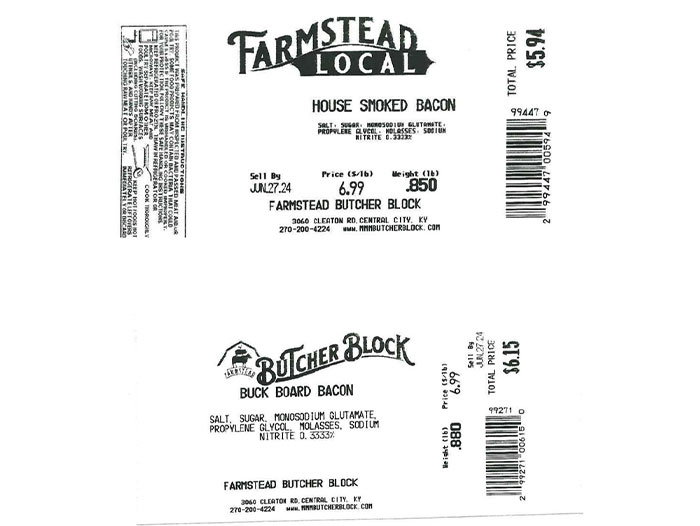 - Packages purchased by weight at the retail counter containing “FARMSTEAD BUTCHER BLOCK BUCK BOARD BACON,” bearing sell by dates MAY.2.24 through JUN.27.24.