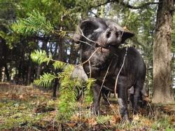Far from the farm’s cozy barn, four black pigs bed down on the forest floor.