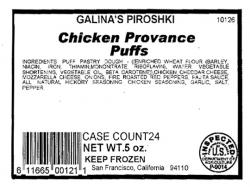 Cardboard trays containing 24 puffs, labeled "GALINA'S PIROSHKI, Chicken Provance Puffs." The bottom center of each label reads "CASE COUNT 24, NET WT. 5 oz., KEEP FROZEN." Each package bears the establishment number "P-9014" inside the USDA mark of inspection. Partial orders may have been placed, in which case the cardboard trays contain fewer than 24 puffs per tray.