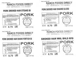 - Various sized containing “RANCH FOODS DIRECT PORK SMOKED HAM SHANK PORTION BI.”