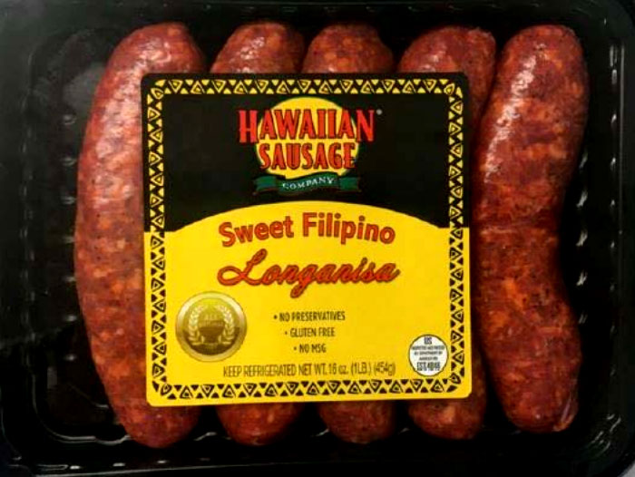 - 1-lb. thermoform tray packages containing “HAWAIIAN SAUSAGE COMPANY Sweet Filipino Longanisa ˙NO PRESERVATIVES ˙GLUTEN FREE ˙NO MSG” with lot codes 09067, 09081, 09088, 09113, 09130, 09148, 09156, 09163, 09170, 09179, 09193 and 09212 on the label.