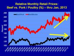 That’s especially important as beef looks to compete with much cheaper alternatives. Beef is running at 240% the price of chicken and 140% that of pork.