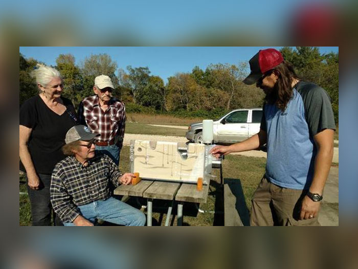 Southfork Watershed Alliance (SFWA) board members (from left) Jo Baumannn, John Gilbert and Vern Schwartz recently presented Chris Barber, Calkin’s Nature Area manager, with a ground water flow model. The SFWA purchased the model with a contribution from Niman Ranch in recognition of Gilbert and his family as their Sustainable Farm of the Year. The model will permit Calkins to better teach how water moves through the soil and the importance of protecting it. The Gilberts have sold their pigs to Niman Ranch for more than 20 years.
