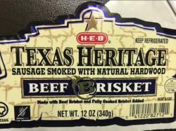 - 12 oz. vacuum-packed packages of “H-E-B TEXAS HERITAGE SAUSAGE SMOKED WITH NATURAL HARDWOOD BEEF BRISKET.”