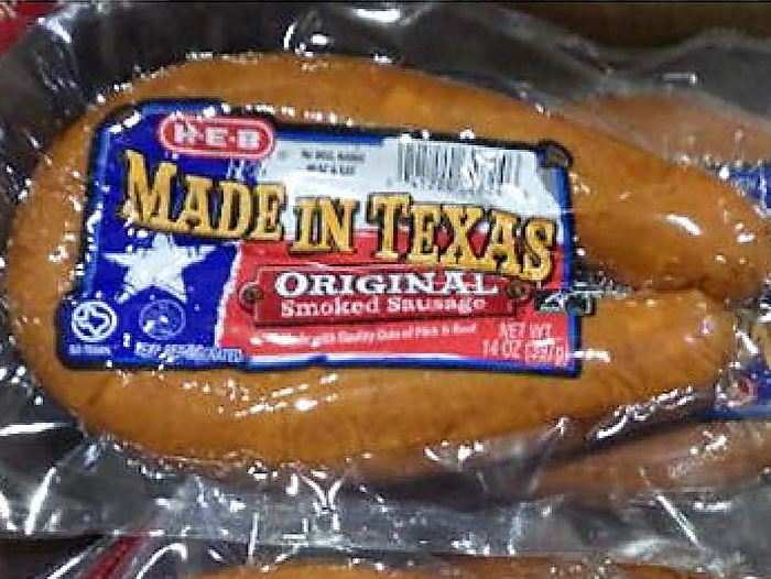 • 14-oz. vacuum-sealed packages of “H-E-B MADE IN TEXAS ORIGINAL Smoked Sausage” with a sell by date of 5/19/19 and lot code LN2 90149.