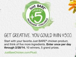 The entry form for submitting Chicken +5 ingredient lists is now active at www.JustBareChicken.com/Plus5. Consumers are limited to one entry per 24-hour day.