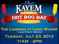 Kayem's National Hot Dog Day celebration will begin at 11 a.m. and continue until 2 p.m. on Tuesday, July 23. Guests will have the opportunity to enjoy a free Kayem frank, enter raffles for a chance to win Kayem and Boston Harbor Cruises prizes, and have their photo taken with Red Sox Shane Victorino and Wally the Green Monster. Kevin Karlson of 100.7 WZLX will provide music and the WZLX and Canobie Lake street team will provide fun giveaways to guests all afternoon.